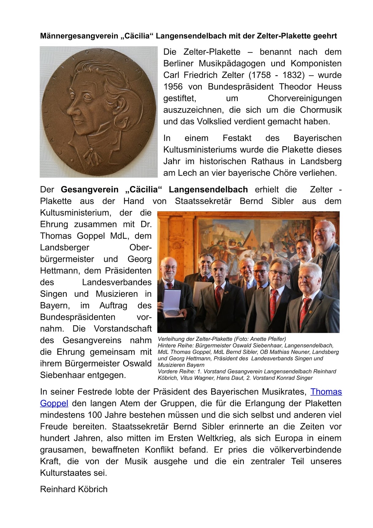Am 1. Juli 2017 wurde uns die "Zelter-Plakette" verliehen. Siehe hierzu auch den Pressebericht.